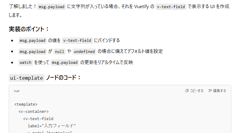 Vue + Vuetify でできた Node-RED Dashboard 2.0 で自作 UI が作れる template ノードが ChatGPT のコード生成でやりやすかったメモ