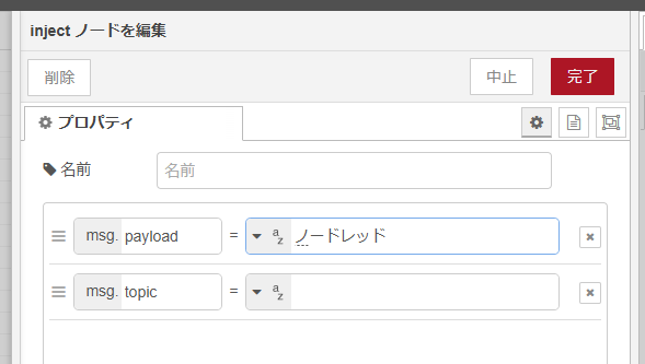 このようにノードレッドという文字列を出力するようにします。