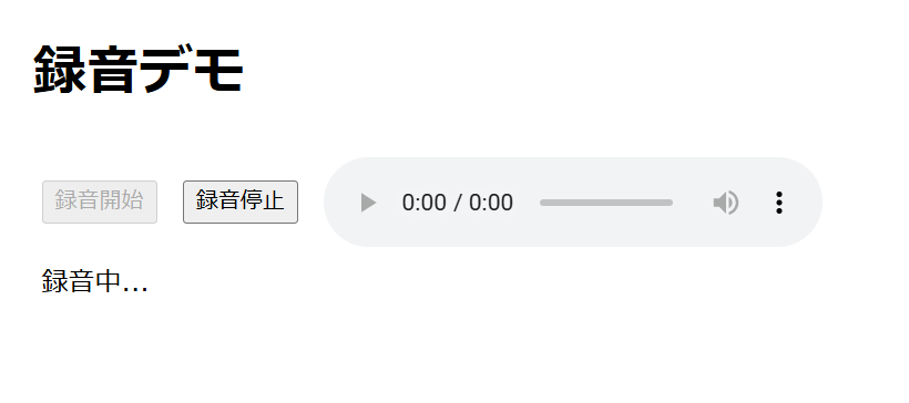 このような UI です。録音開始ボタン、録音停止ボタン、音データ再生プレイヤー、ステータス表示(現在は未録音)があります。