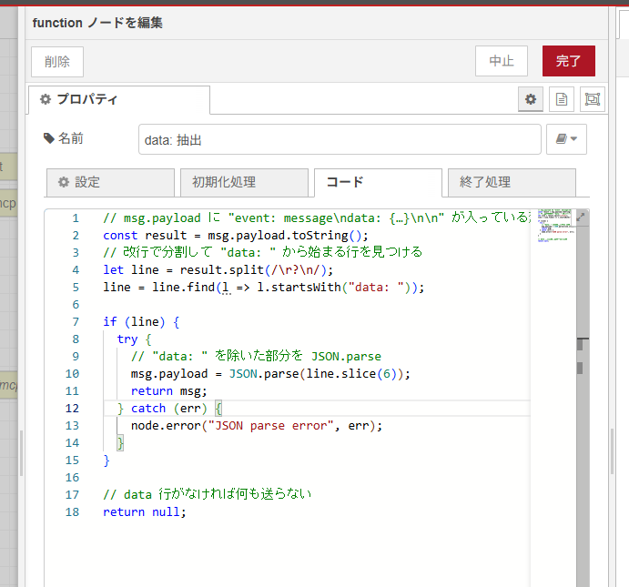 // msg.payload に "event: message\ndata: {…}\n\n" が入っている想定