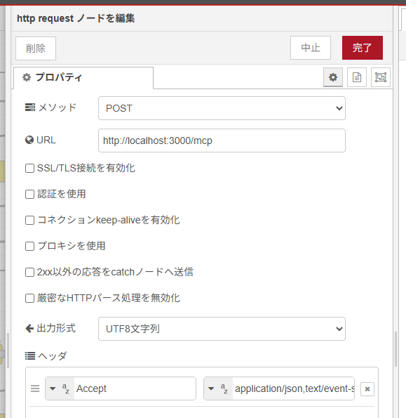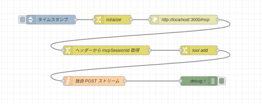 ここが今回の大事な部分 POST で HTTP ストリーミングをするという function ノードです。 GET で HTTP ストリーミングするなら EventSource モジュールとか使えるみたいなのですが、今回のステートフルサンプルだと POST リクエストで行いますし MCP としてのやりとりが加わるので、独自で組むことにしました。