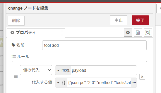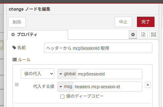 ヘッダーから mcpSessionId 取得の change ノードはこのようになっています。