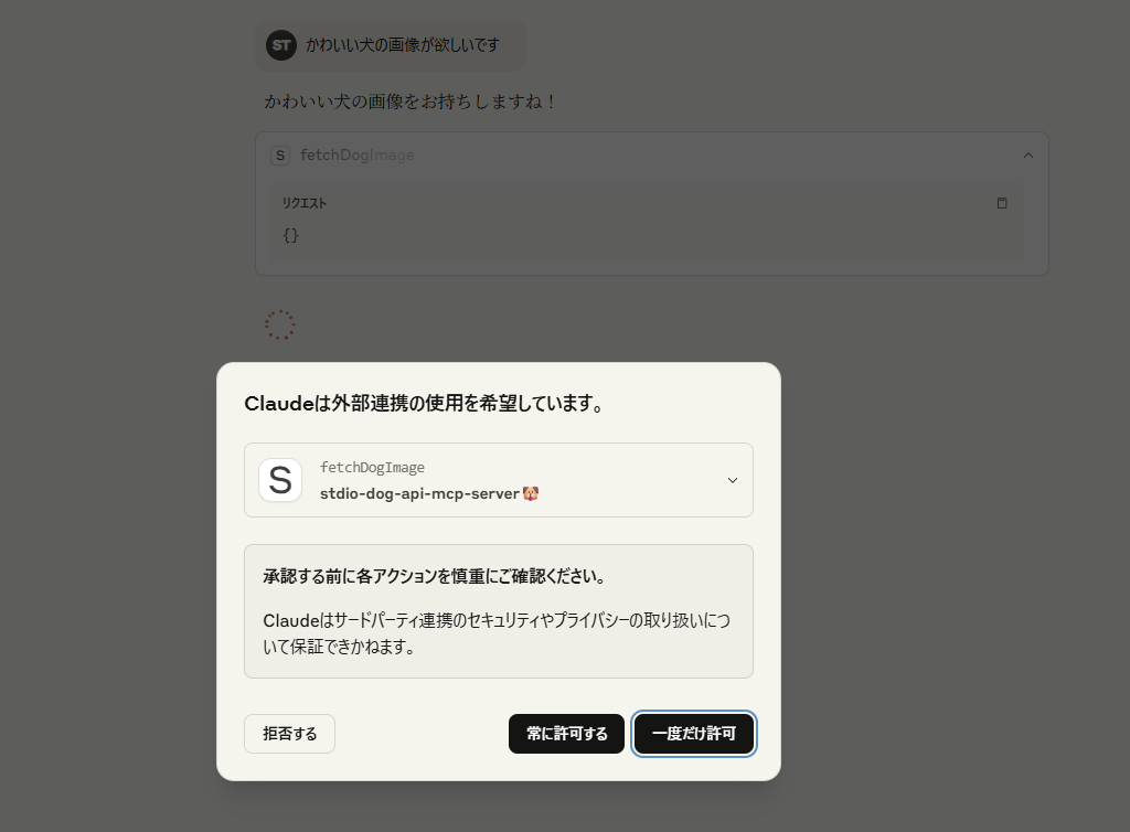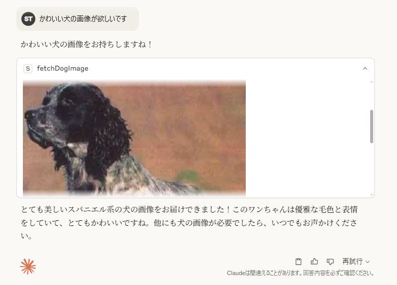 このように「かわいい犬の画像が欲しいです」と聞いてみると先ほどのが stdio-dog-api-mcp-server 選定されます。犬アイコンかわいいですね。