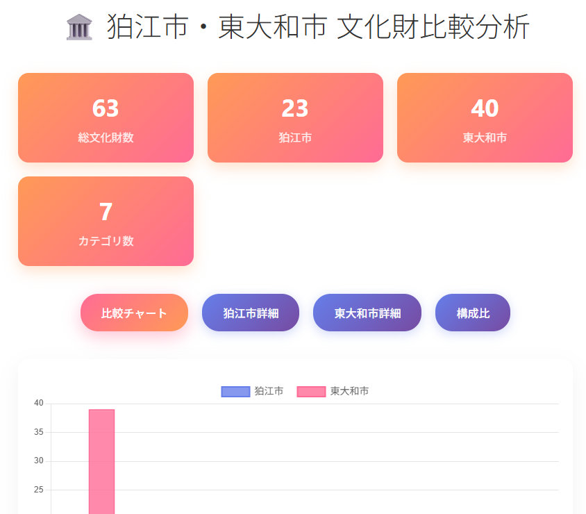東大和市が指定等を行った文化財の一覧も加えて、狛江市のデータと分析してみてください。カテゴリごとの傾向を見るのが最初はイイかなと。