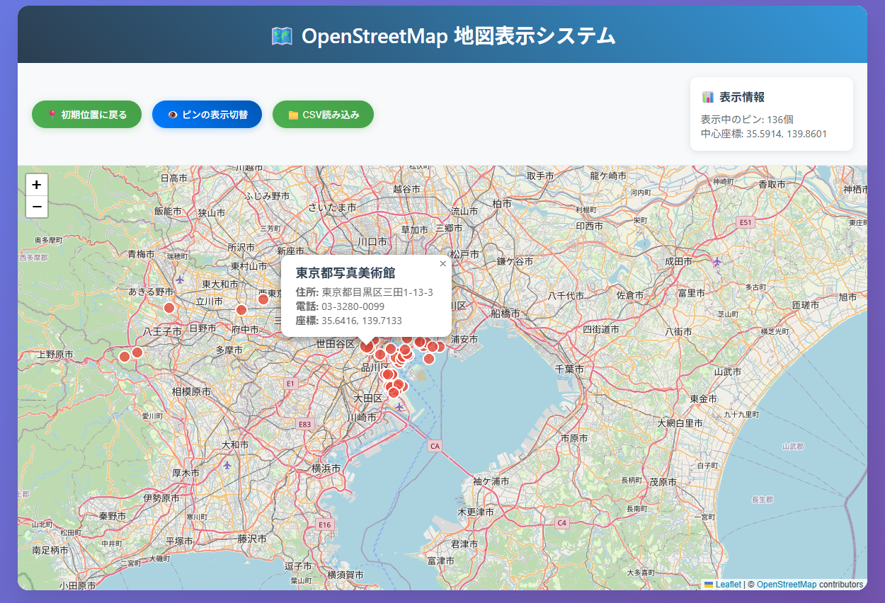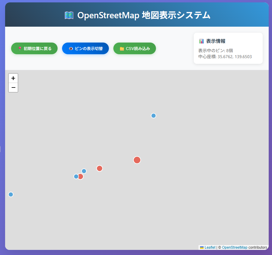 OpenStreetMap で地図表示の仕組みを作ってください。このあと位置情報 CSV を読み込むか埋め込んで各情報をピンで配置します。ひとまずいまはダミーで主要都市の位置情報で。