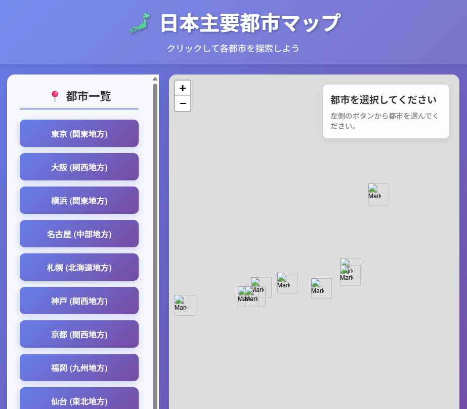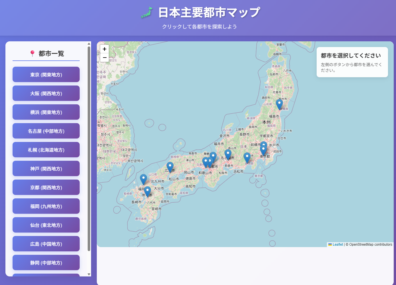 OpenStreetMap を使って日本の主要都市へフォーカス移動できるコンテンツを作ってください。