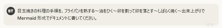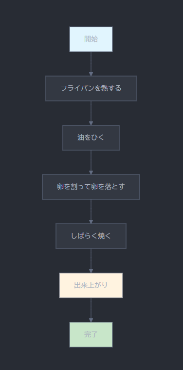 目玉焼きの料理の手順を、フライパンを熱する~油をひく~卵を割って卵を落とす~しばらく焼く~出来上がりで Mermaid 形式でドキュメントに書いてください。