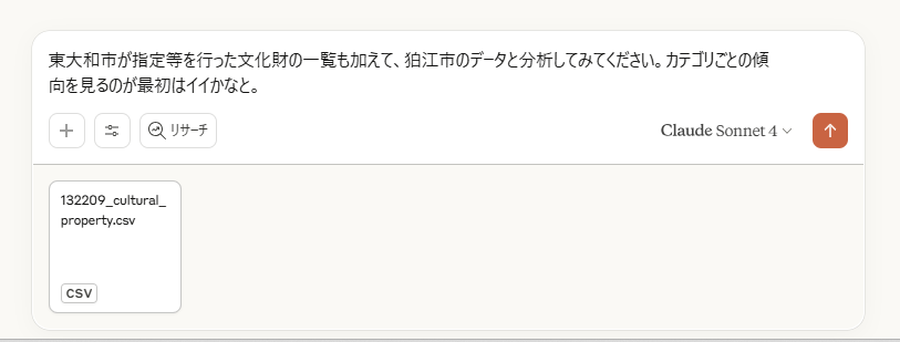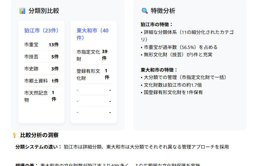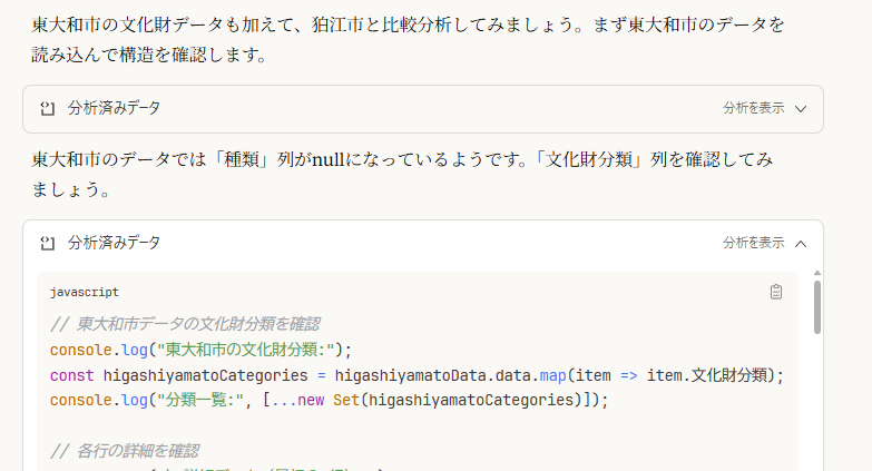 狛江市の文化財データに 東大和市が指定等を行った文化財の一覧 をさらにアップロードして分析もできます。こういう複雑な分析もやってくれるので、自分が思いもしなかったポイントに出会えたりします。