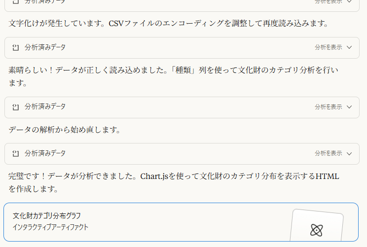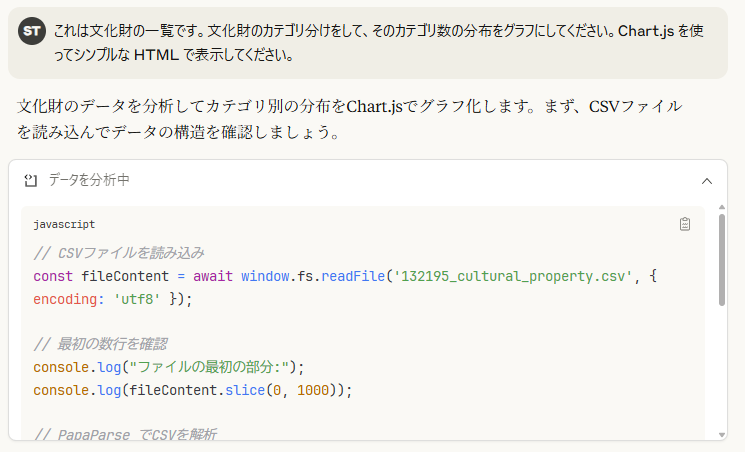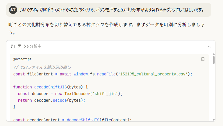 Claude の調子にもよりますが、上記の会話でデータが読まれている状態で、さらにちょっとインタラクティブなグラフもできます。