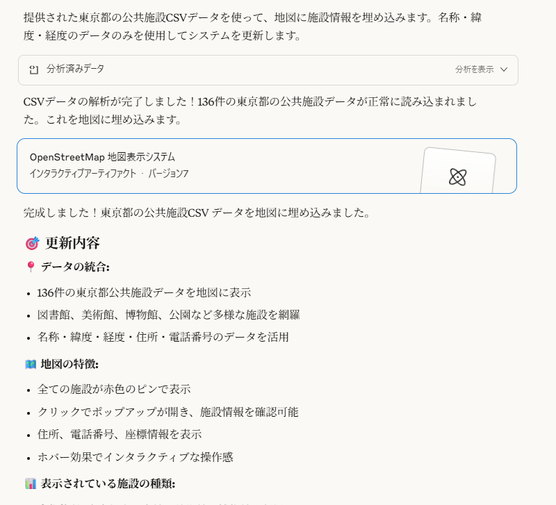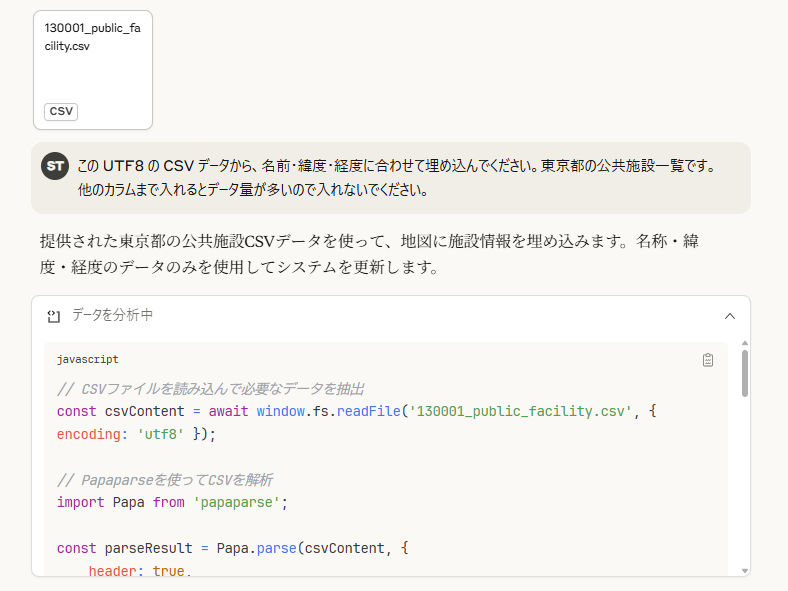 そのうえで 東京都の公共施設一覧 を手元のメモ帳で文字コードを UTF8 にしたものをアップロードして、以下のようにお願いします。