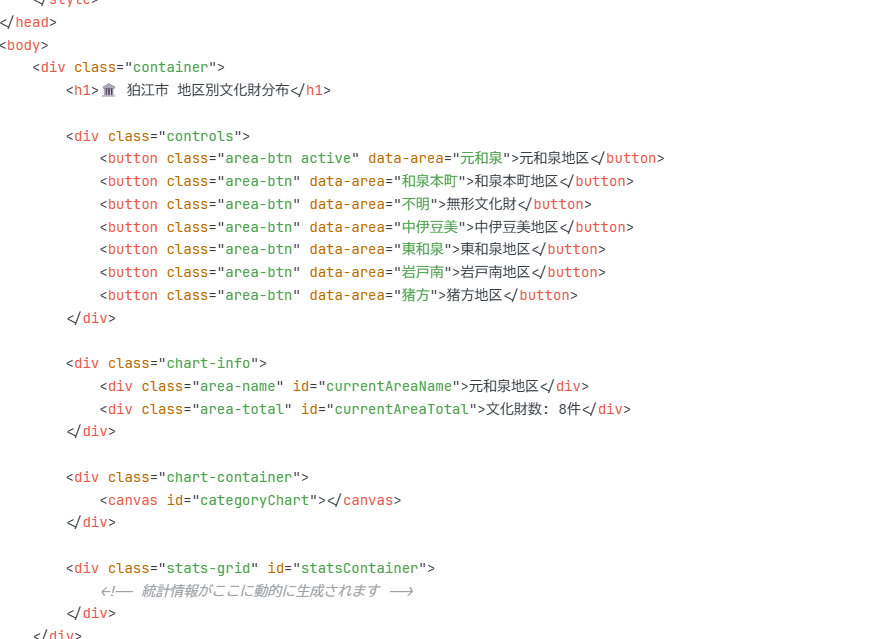 これは文化財の一覧です。文化財のカテゴリ分けをして、そのカテゴリ数の分布をグラフにしてください。Chart.js を使ってシンプルな HTML で表示してください。
