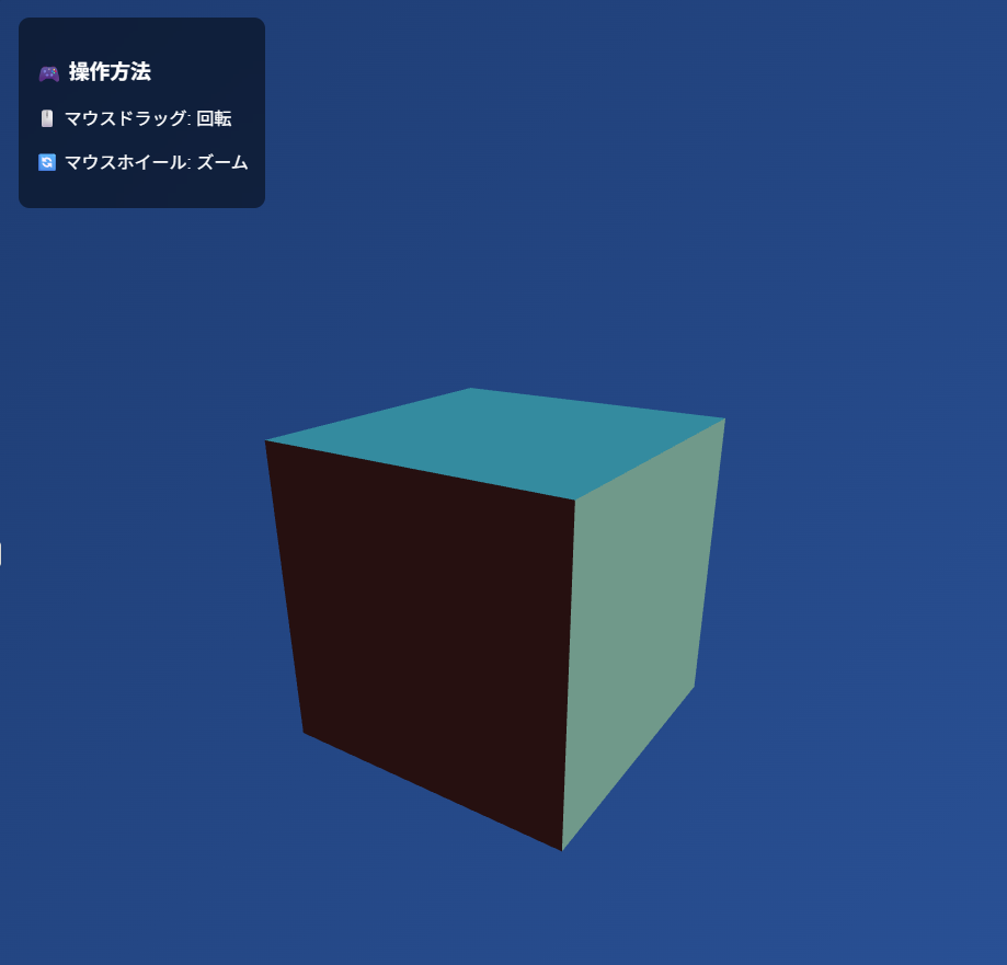 3D 立方体を回せるインタラクティブな HTML を Three.js を使って表示してください。
