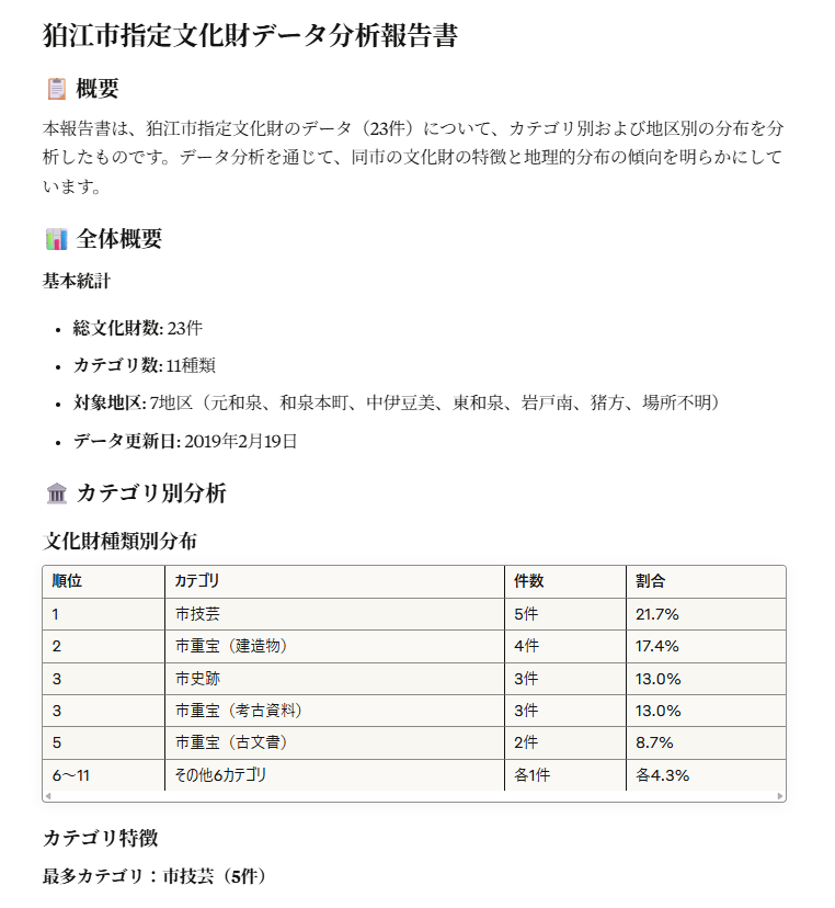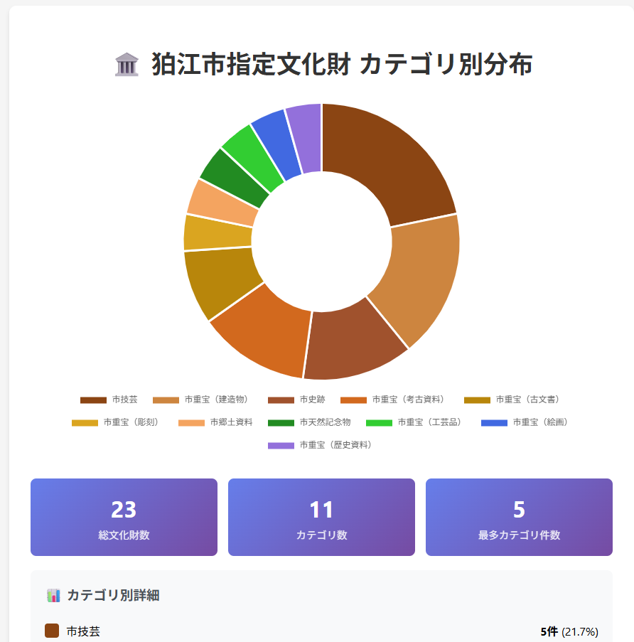 本報告書は、狛江市指定文化財のデータ(23件)について、カテゴリ別および地区別の分布を分析したものです。データ分析を通じて、同市の文化財の特徴と地理的分布の傾向を明らかにしています。