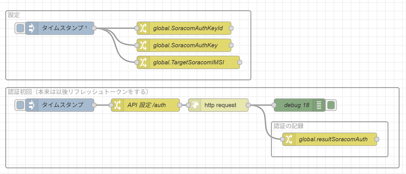 global.resultSoracomAuth という形で Node-RED グローバル変数に入れて使いまわします。本来であれば、以後、API にアクセスを保持したいときはリフレッシュトークンが必要です。