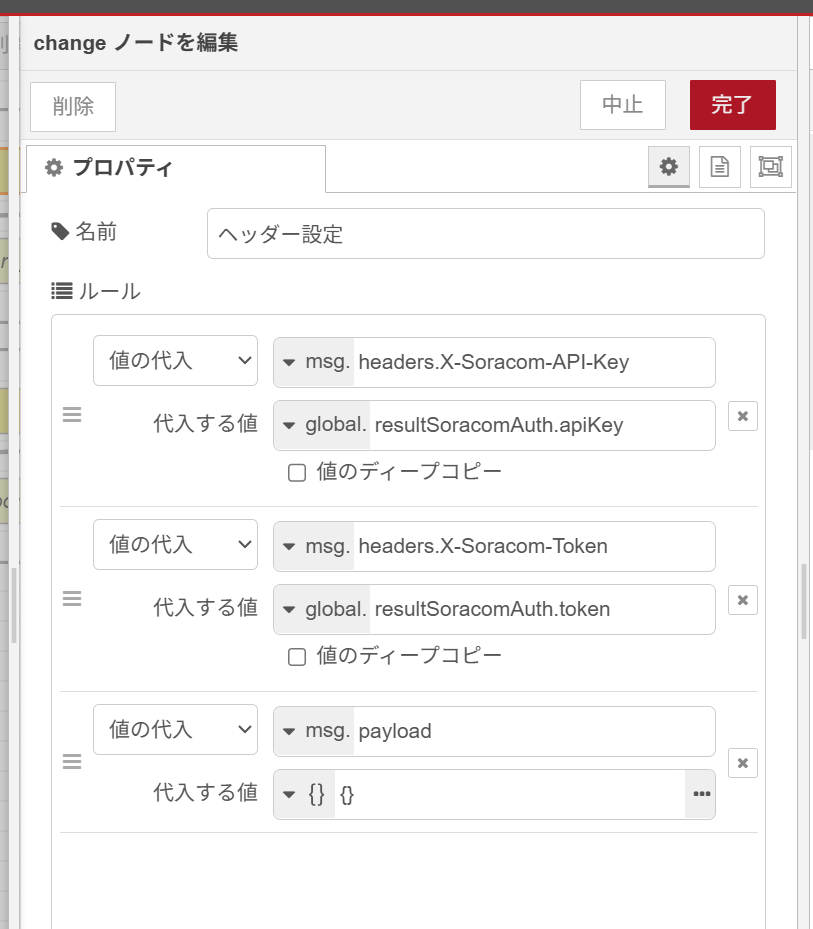 こちらもヘッダー設定 change ノードについては先ほどの一覧と同様にグローバル変数からヘッダーに API キーと API トークンを設定します。