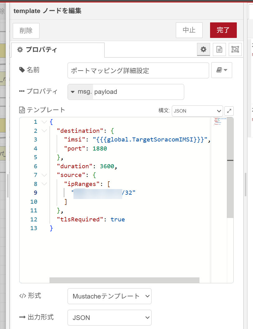 global.TargetSoracomIMSI には対象の SIM の IMSI を事前にグローバル変数で指定しているので {{{global.TargetSoracomIMSI}}} という形でデータが入ります。