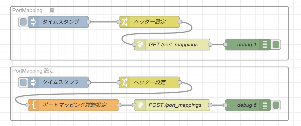[{"id":"6e5f88246524facf","type":"group","z":"7b778279626ef599","name":"PortMapping 設定","style":{"label":true},"nodes":["a1460734cc7a2897","bb70431a354506a7","d4f3136fdb0f8535","70406fad2b4caeb2","49cd87d3825337b6"],"x":54,"y":199,"w":732,"h":142},{"id":"a1460734cc7a2897","type":"inject","z":"7b778279626ef599","g":"6e5f88246524facf","name":"","props":[{"p":"payload"},{"p":"topic","vt":"str"}],"repeat":"","crontab":"","once":false,"onceDelay":0.1,"topic":"","payload":"","payloadType":"date","x":180,"y":240,"wires":[["bb70431a354506a7"]]},{"id":"bb70431a354506a7","type":"change","z":"7b778279626ef599","g":"6e5f88246524facf","name":"ヘッダー設定","rules":[{"t":"set","p":"headers.X-Soracom-API-Key","pt":"msg","to":"resultSoracomAuth.apiKey","tot":"global"},{"t":"set","p":"headers.X-Soracom-Token","pt":"msg","to":"resultSoracomAuth.token","tot":"global"},{"t":"set","p":"payload","pt":"msg","to":"{}","tot":"json"}],"action":"","property":"","from":"","to":"","reg":false,"x":420,"y":240,"wires":[["49cd87d3825337b6"]]},{"id":"d4f3136fdb0f8535","type":"http request","z":"7b778279626ef599","g":"6e5f88246524facf","name":"POST /port_mappings","method":"POST","ret":"obj","paytoqs":"ignore","url":"https://api.soracom.io/v1/port_mappings","tls":"","persist":false,"proxy":"","insecureHTTPParser":false,"authType":"","senderr":false,"headers":[],"x":480,"y":300,"wires":[["70406fad2b4caeb2"]]},{"id":"70406fad2b4caeb2","type":"debug","z":"7b778279626ef599","g":"6e5f88246524facf","name":"debug 6","active":true,"tosidebar":true,"console":false,"tostatus":false,"complete":"false","statusVal":"","statusType":"auto","x":680,"y":300,"wires":[]},{"id":"49cd87d3825337b6","type":"template","z":"7b778279626ef599","g":"6e5f88246524facf","name":"ポートマッピング詳細設定","field":"payload","fieldType":"msg","format":"json","syntax":"mustache","template":"{\n \"destination\": {\n \"imsi\": \"{{{global.TargetSoracomIMSI}}}\",\n \"port\": 1880\n },\n \"duration\": 3600,\n \"source\": {\n \"ipRanges\": [\n \"XXX.XXX.XXX.XXX/32\"\n ]\n },\n \"tlsRequired\": true\n}","output":"json","x":220,"y":300,"wires":[["d4f3136fdb0f8535"]]},{"id":"95ac2a623051685d","type":"group","z":"7b778279626ef599","name":"PortMapping 一覧","style":{"label":true},"nodes":["b5c5b5489d9754bf","4708116bfd5d15a7","6af0064048699f95","22f5a55e4feab44b"],"x":54,"y":39,"w":732,"h":142},{"id":"b5c5b5489d9754bf","type":"inject","z":"7b778279626ef599","g":"95ac2a623051685d","name":"","props":[{"p":"payload"},{"p":"topic","vt":"str"}],"repeat":"","crontab":"","once":false,"onceDelay":0.1,"topic":"","payload":"","payloadType":"date","x":180,"y":80,"wires":[["4708116bfd5d15a7"]]},{"id":"4708116bfd5d15a7","type":"change","z":"7b778279626ef599","g":"95ac2a623051685d","name":"ヘッダー設定","rules":[{"t":"set","p":"headers.X-Soracom-API-Key","pt":"msg","to":"resultSoracomAuth.apiKey","tot":"global"},{"t":"set","p":"headers.X-Soracom-Token","pt":"msg","to":"resultSoracomAuth.token","tot":"global"},{"t":"set","p":"payload","pt":"msg","to":"{}","tot":"json"}],"action":"","property":"","from":"","to":"","reg":false,"x":420,"y":80,"wires":[["6af0064048699f95"]]},{"id":"6af0064048699f95","type":"http request","z":"7b778279626ef599","g":"95ac2a623051685d","name":"GET /port_mappings","method":"GET","ret":"obj","paytoqs":"ignore","url":"https://api.soracom.io/v1/port_mappings","tls":"","persist":false,"proxy":"","insecureHTTPParser":false,"authType":"","senderr":false,"headers":[],"x":480,"y":140,"wires":[["22f5a55e4feab44b"]]},{"id":"22f5a55e4feab44b","type":"debug","z":"7b778279626ef599","g":"95ac2a623051685d","name":"debug 1","active":true,"tosidebar":true,"console":false,"tostatus":false,"complete":"false","statusVal":"","statusType":"auto","x":680,"y":140,"wires":[]}]