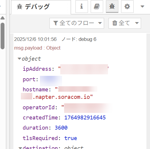inject ノードをクリックして実行すると、このようにポートマッピングに登録できたデータが取得できます。